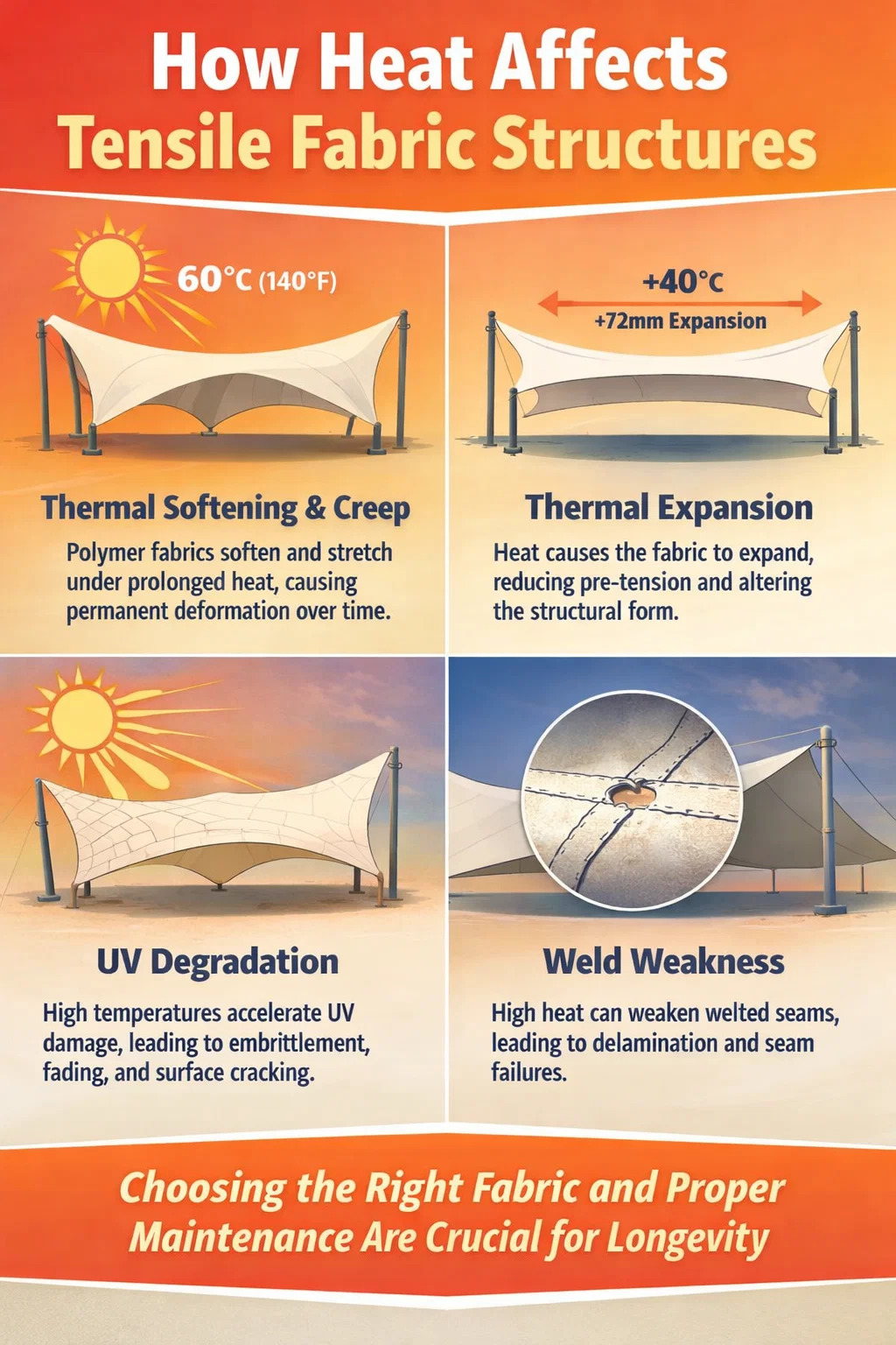 Varme påvirker trækstof på tre forskellige måder: det blødgør materialet, accelererer UV-nedbrydning og forårsager dimensionsudvidelse, der ændrer forspændingen, der er indbygget i strukturen. At forstå hver af disse mekanismer hjælper dig med at vælge det rigtige stof og sætte realistiske forventninger til vedligeholdelse.