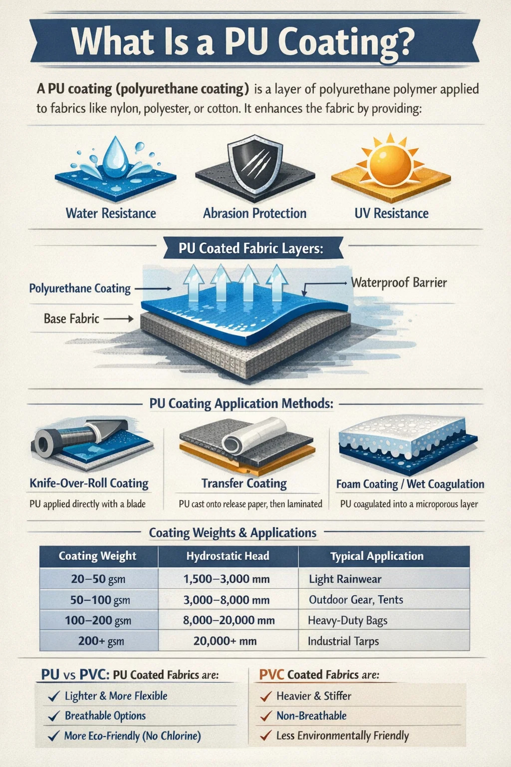 En PU-belægning - en forkortelse for polyurethanbelægning - er et lag af polyurethanpolymer, der påføres direkte på et basisstof, såsom nylon, polyester eller bomuld, for at forbedre dets ydeevneegenskaber. Belægningen binder kemisk og mekanisk til tekstiloverfladen, hvilket skaber en kontinuerlig, fleksibel film, der modstår vandindtrængning, slid og i mange formuleringer ultraviolet nedbrydning.
