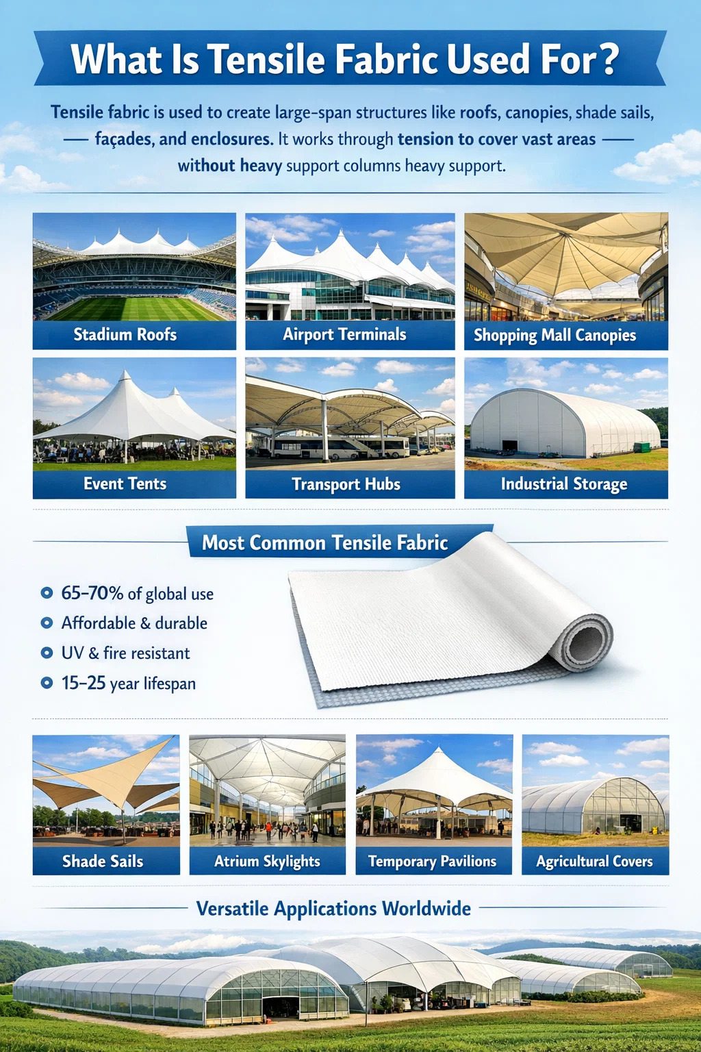 Trækstof bruges til at skabe store arkitektoniske strukturer - tage, baldakiner, skyggesejl, facader og indhegninger - der kombinerer strukturel styrke med letvægtsfleksibilitet. I modsætning til konventionelle stive tagmaterialer fungerer trækstof ved at fordele belastning gennem spænding frem for kompression, hvilket betyder, at det kan dække enorme områder uden tunge støttesøjler eller tyk indfatning. I praksis vil du finde trækstof på sportsstadioner, lufthavnsterminaler, baldakiner i indkøbscentre, udendørs arrangementssteder, parkeringspladser, forlystelsesparker og endda brogange rundt om i verden.